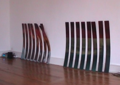 Quatres bandes sonores différentes constituées d'un air de piano lent et saccadé sont accompagnés de quatre photographies peintes illustrant pour deux d'entre elles une main de pianiste, pour les deux autres un oeil fermé. Passé et présent s'entremêlent : le morceau de piano précédemment enregistré adhère au présent par sa diffusion. Quant aux photos, elles sont fragmentées en bandes verticales séparées les unes des autres par un espacement régulier qui autorise l'intrusion du lieu d'exposition au sein du sujet photographié. Le vide est particulièrement présent dans cette installation puisque les photographies, unique composante matérielle sont accollées aux murs, délaissant l'espace à l'étrange musique générée par la superposition des morceaux de piano. L'association de cet espace vide à la musique lente propose une rupture face à notre habituel mode de fonctionnement basé sur la volonté de "rentabiliser", de "remplir" nos vies par la réalisation d'une activité souvent prédéterminée. |